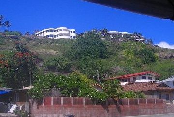 ![]() 白い建物が米国の映画俳優キアノ・リーブスの別荘 《ココナマリーナ》で降ろされ、専用の往復タクシー1人$4支払、最終ハナウマ4:00pmと通告されてあせあせ! タクシーが来ないのに、余裕のカメラマンとすごい不安な私。 2:45pm>3:00乗り込む>運転手が英語で1時間では無理と。 |