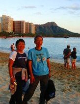 ![]() 夫婦でワイキキビーチでの記念写真 6:15pm 人が多すぎるので、前へ前へ・・・Yukuoさん撮影 |