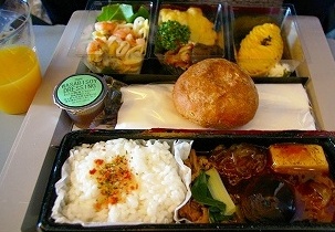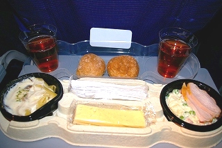 ![]() 最初の機内食はチキン |