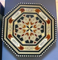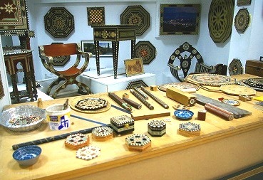 ![]() オリ−ブの木などを使ったグラナダの伝統工芸品、タラセア(アラブの寄木細工) 金太郎飴のように模様を作り、薄く切って張り合わせる。 |
