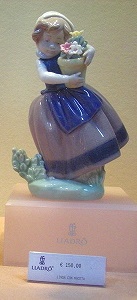 スペインが誇るポーセリンアート(陶磁器芸術) ![]() 157ユーロ↑ 『リアドロ』 陶器とは思えない柔らかな曲線、淡く繊細な色使いの人形で有名。 ↑150ユーロ 1950年代にバレンシア均衡でリヤドロ3兄弟によって生み出された、いまでも人形制作はハンドメイドである。 ほしーい!が・・・あまりの高額で断念! |