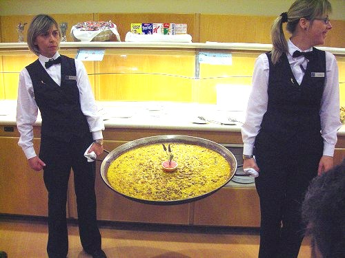 ![]() ディナーはシーフードパエリヤでこれでツアー全員の量です。 |