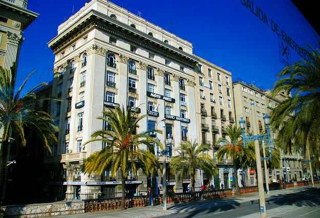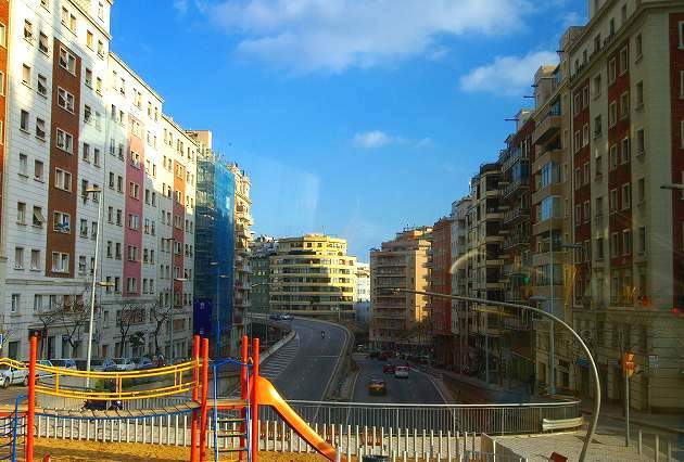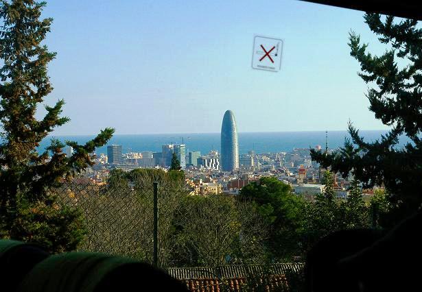 グエル公園への車中から 「アグパール・タワー」142mは水道局のビル(6万枚のガラスパネルを張り合わせた) |