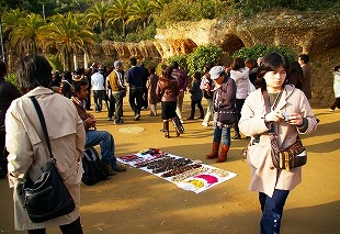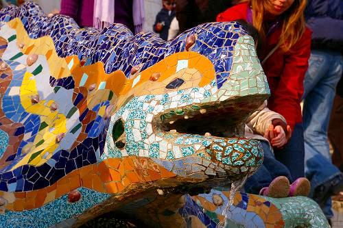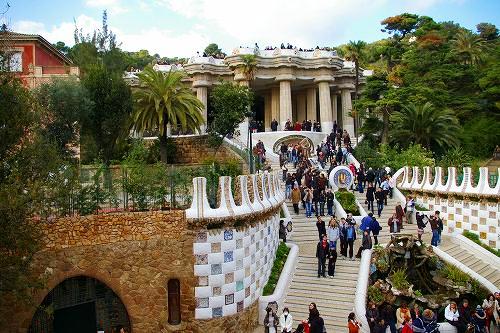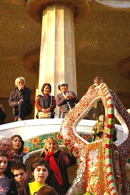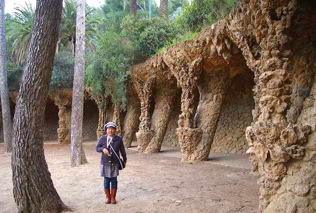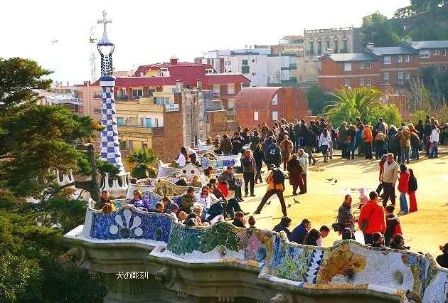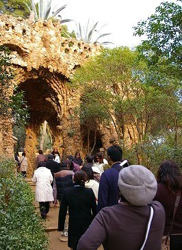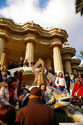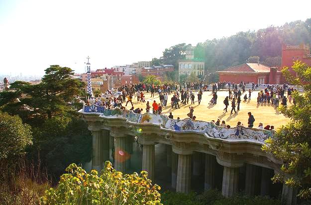 ![]() グエル公園の広場(椅子までモザイクタイル) 1900年〜1914年に建造。 施主のエウセビオ・グエル伯爵とアントニ・ガウディの夢が作り上げた分譲住宅で、 60軒が計画されたが売れず、ガウディ本人とグエル伯爵が買い上げた2軒だけ。 人々が自然と芸術に囲まれて暮らせる、新しい住宅地を作ろうとしたが、 ふたりの進みすぎた発想と自然の中で暮らす価値観は、当時理解されなかった。 今なら最高の見晴らしと生活空間が、自然の中に溶け込んだ60軒の人達の贅沢な広場だったのに? |
