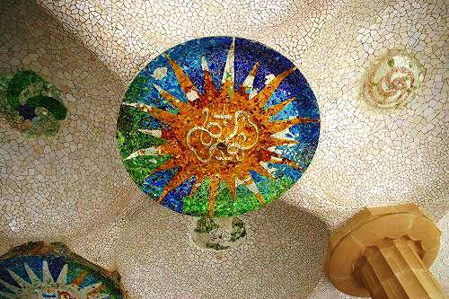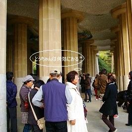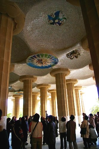 ![]() グエル公園広場の下は、おびただしい列柱(ドリス式)が支え、天井にもモザイクが・・・ |