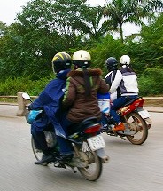 ![]() バイクの二人乗りはOKで、子供二人までOKで4人乗りしてる。自転車で花を運ぶベトナムの運送手段です。 |