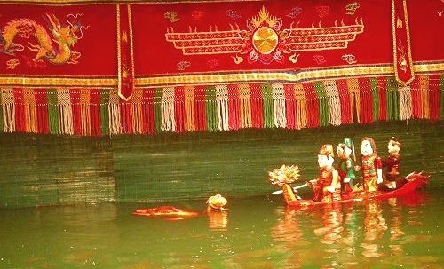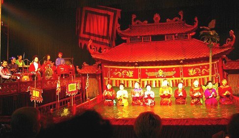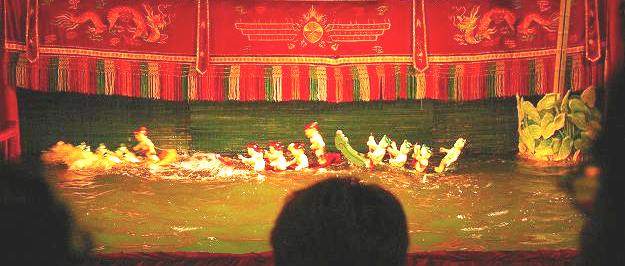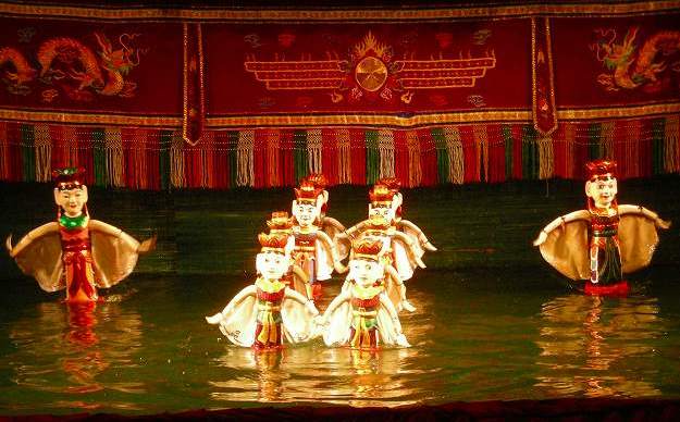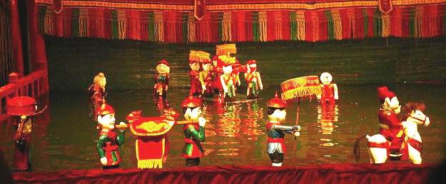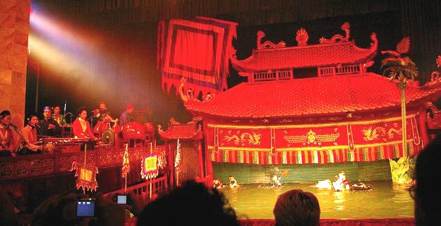 ![]() 伝統芸能『水上人形劇』 民族楽器の演奏と歌で、17の演目(農家の生活)が約1時間にわたって繰り広げられる。 |