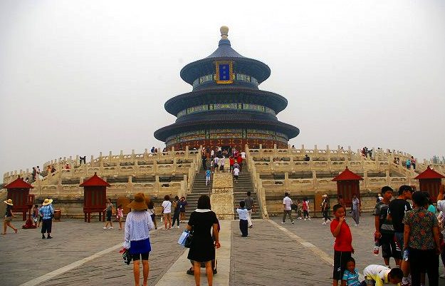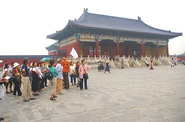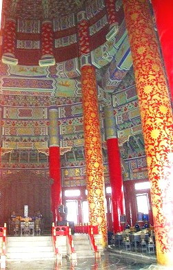 ![]() 天壇公園の『祈年殿』は直径32m、高さ38mの円形木造建築。 祭祀の中心となっていた祈年殿(チー・ニイエン・ディエン)三段の円形石壇の上に建つ。 |