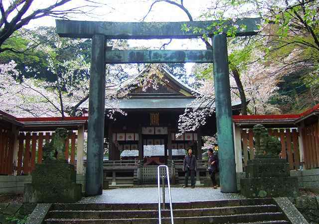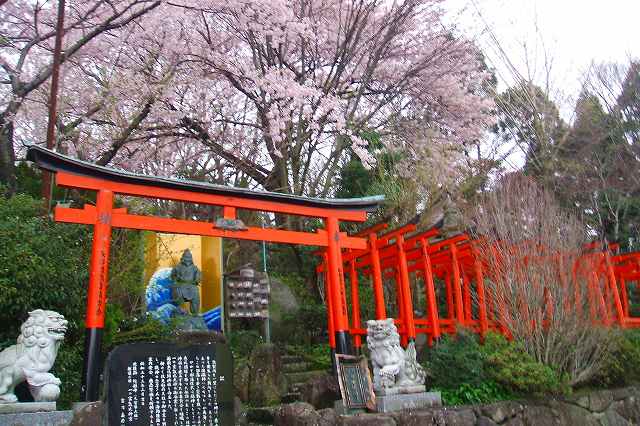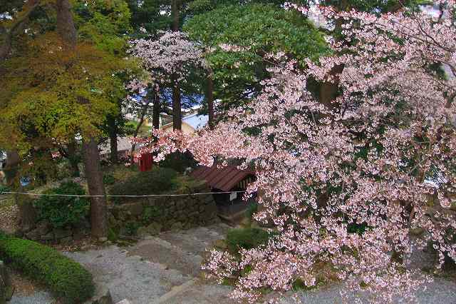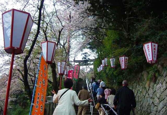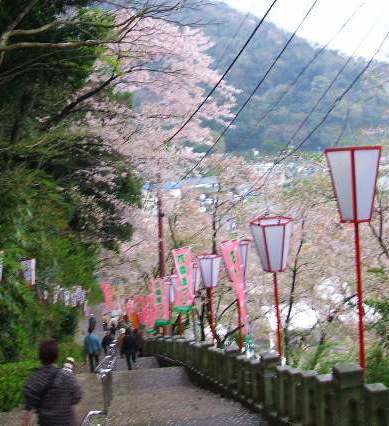 「雨、上がったね!」金崎宮(かねがさきぐう)参道は階段・階段で、桜は落下盛ん!(JR稲生駅の隣) |