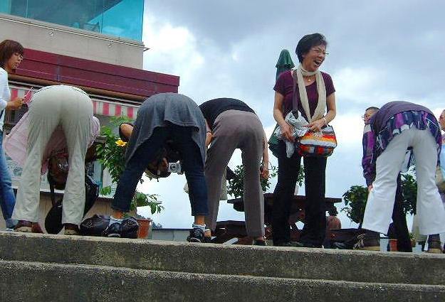 ![]() 海運を願って瓦投げ「えいっ!」三枚目がリングに当たったら周りの人が拍手!3枚\100です。 |