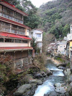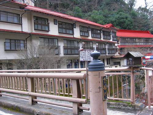 ![]() 橋から見た湯元館 屋内に湧出口を3ヶ所所有し、湧出量はbPです。泉質は、単純アルカリ温泉 |