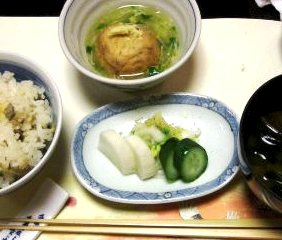 ![]() ヘルシーな料理にまだ笑顔は・・・ |