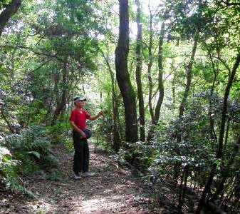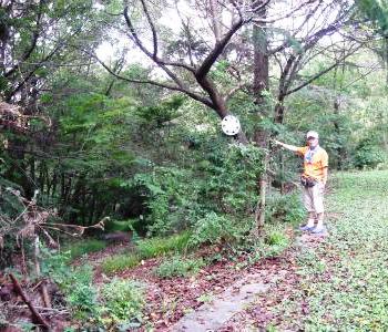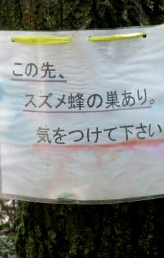 ![]() 三角点への案内を見つけめざすが、木にスズメ蜂の張り紙。2人共すぐ引き返す。 |
