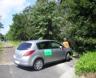 ![]() 真夏のような暑さで汗びっしょりの二人*パトロールの車発見で東南の入口も発見 |