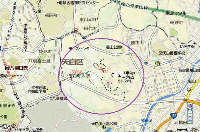 ![]() 千種区東山テニスセンターを通り抜けて直ぐの場所 地図には道が続いている直進の道はとても入る気がしない(タクシー会社の敷地) |