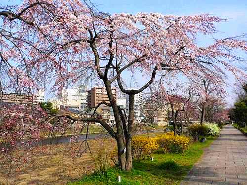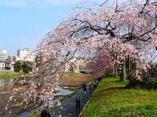 昨日は京都も桜の開花宣言が出されたが、鴨川の枝垂桜も一部が咲いていました。 今日は非常に暖かかったので開花も進むでしょう。 桜の下に黄色のレンギョーと白い雪柳が咲いているところもあり、目の保養になりました。 |
