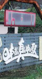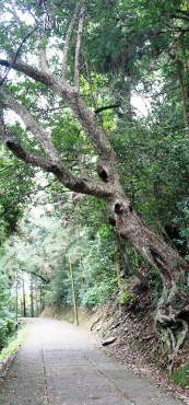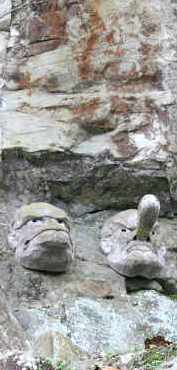 ![]() 1,368の石段を登ったところ、琴平の街並みを一望に見渡す高台にたたずむ奥社。 奥社の西側、垂直に切り立った岩壁の上方に、荒々しい表情の天狗面が見られる |