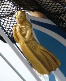 ![]() 海王丸の船首像(横笛を吹く女性の「紺青こんじょう」)です。 『因みに姉妹船日本丸の船首像は(手を合わせる女性の「藍青らんじょう」です』 帆を張る訓練「セイルドリル」は> FromOnisiさん111109 < を見てください |