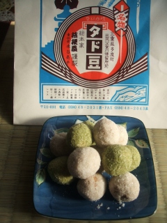 総本家【桔梗屋】 享保元年(江戸の終わり) ![]() 14代目のご主人『タド豆』(きなこ・砂糖・大豆) 添加物はなく、甘みも昔風味で中心に大豆が入っている ぱさつくので数は食べたくない。 |