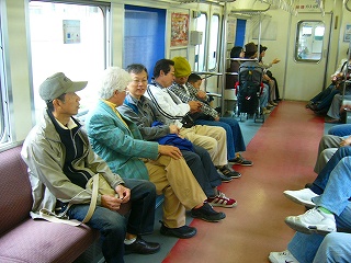 車窓もだんだん長閑な景色に移り変わっていく 男性の方々は静か目? |