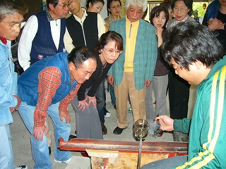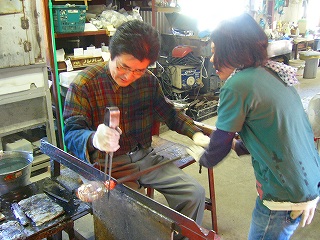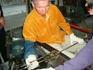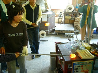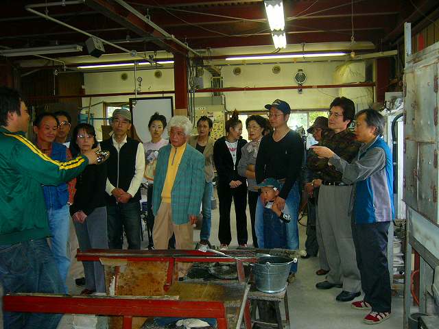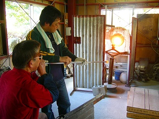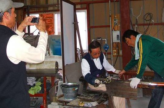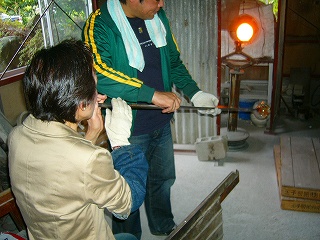 吹きガラスの流れを説明中(特に火傷しないよう) いよいよ製作に心弾む! 吹きガラスは男性が多い! |