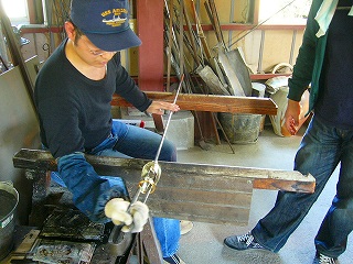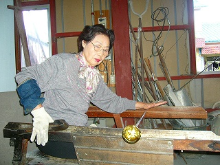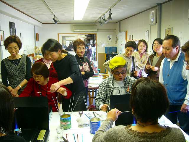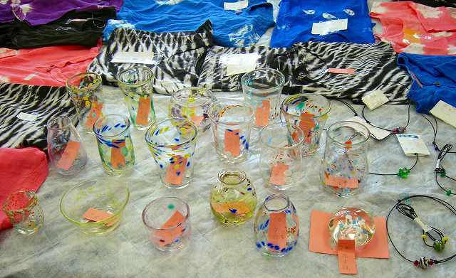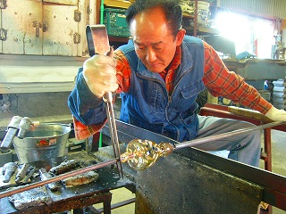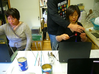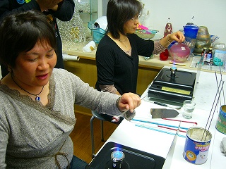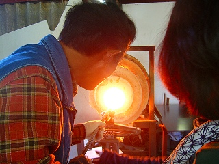 こちらは「トンボ玉」製作中、簡単そうですが難しいのがトンボ玉! 皆真剣そのもの・・緊張感と集中力が自分の世界に入って行く。 |