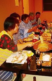![]() テニスと釣りに動き回り、やっと楽しい宴会です! イカを鋏で切るも切れなくぼやく↑ |