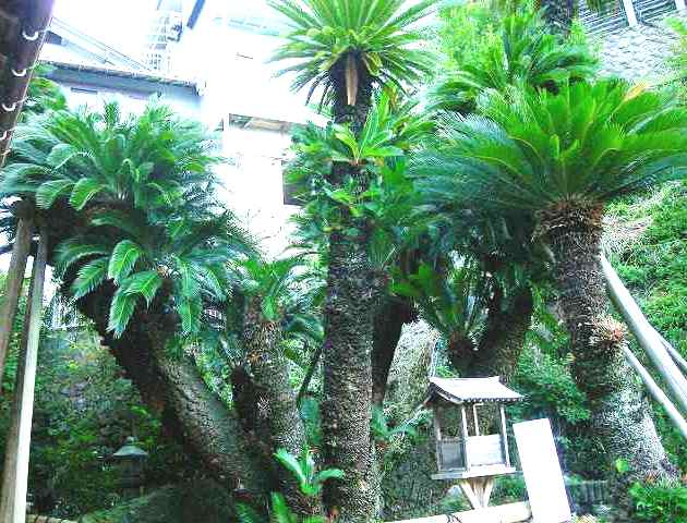 ![]() 根元から樹高4.5〜6.5メートルの支幹5本に分かれ、その全幹の周囲は5.2メートルの巨木。 ソテツは、本来琉球・九州南部の海岸に生育するもので、自生としては、日本海側で最も北に生息する?。 樹齢はおよそ1300年と推測される。(漂流してきたインド人が種子を植えたとも伝えられる) 和名の蘇鉄は、樹が衰えたとき鉄クギを地面に刺して、肥料として与えると元気になるといういわれからきているという。 |