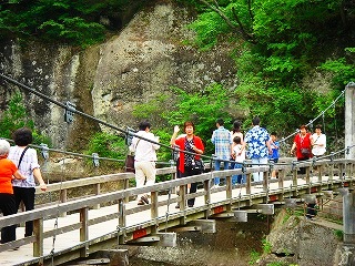![]() 日本一もみじ谷大吊橋 \300 塩原渓谷 320mで無補剛桁歩道吊橋としては、本州一の長さ。 |