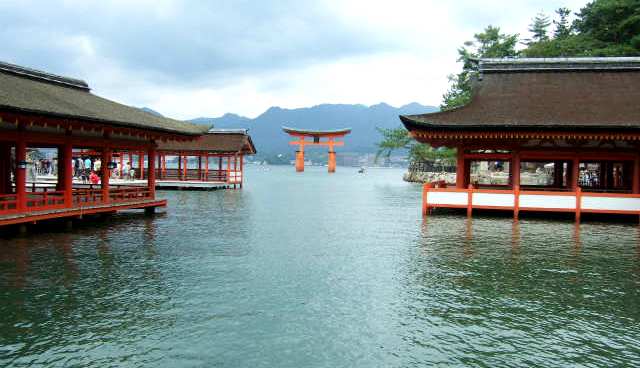 ![]() 平安時代の寝殿造りの粋を極めた建築美。 廻廊で結ばれた朱塗りの社殿は、潮が満ちてくるとあたかも海に浮かんでいるよう。 背後の弥山の緑や瀬戸の海の青とのコントラストはまるで竜宮城を思わせる美しさです |