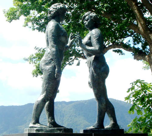 ![]() 「湖水に写った自分の像を見ているうちに、同じものが向かい合い、見合うなかで深まっていくものがあることを感じた。 それで同じものをわざと向かい合わせた」「二体の背の線を伸ばした三角形が″無限″を表す」「彫刻は空間を見る」。 二体の問にできるスキ問に面白味がある」と、モチーフを語った光太郎最後の作品である。 |