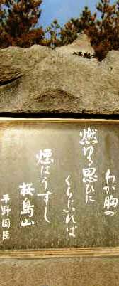 ![]() ![]() 火山・桜島 高さ1,117?(北岳・御岳)、面積約80km2、周囲約52km。 『有村溶岩展望所』 北岳・南岳の2つの主峰から成る複合火山です。霧島錦江湾国立公園に指定されています。 |