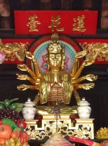![]() 霊沼池に浮かぶ一柱寺の狭い階段を20段ほど昇って行くと 御堂の中には「蓮花台」という扁額が掲げられ、8本手の黄金色をした観音像が中央に据えられています。 |