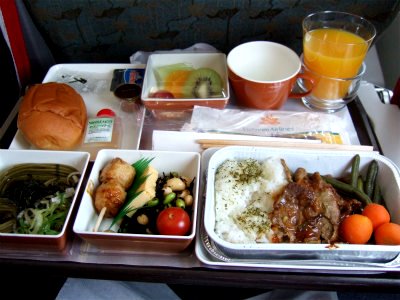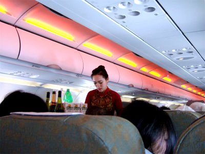 ![]() ベトナム民族衣装のスッチーさん 最初の機内食はとても豪華です |