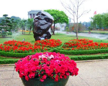 ![]() 綺麗な花をみながら、ホーチミン博物館(右端の写真)を横目で追い『一柱寺』へ向かいます |