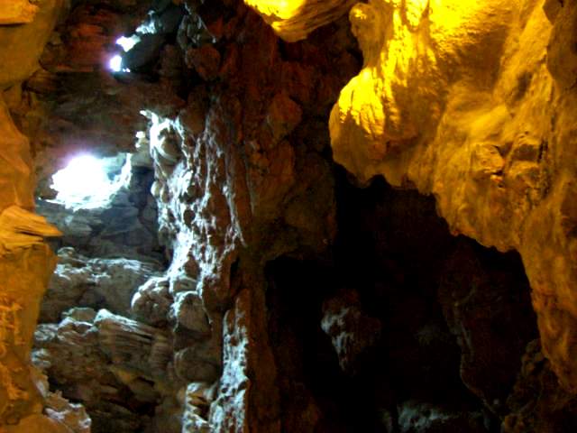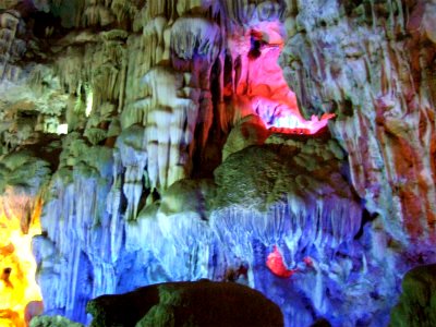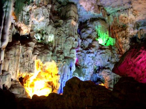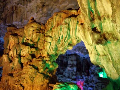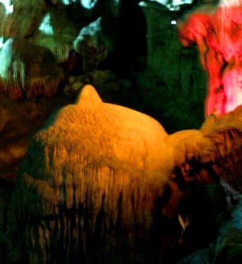 ![]() カラー照明できれいですが、本来の鍾乳洞の雰囲気が損なわれているようにも思われます。 |
