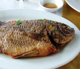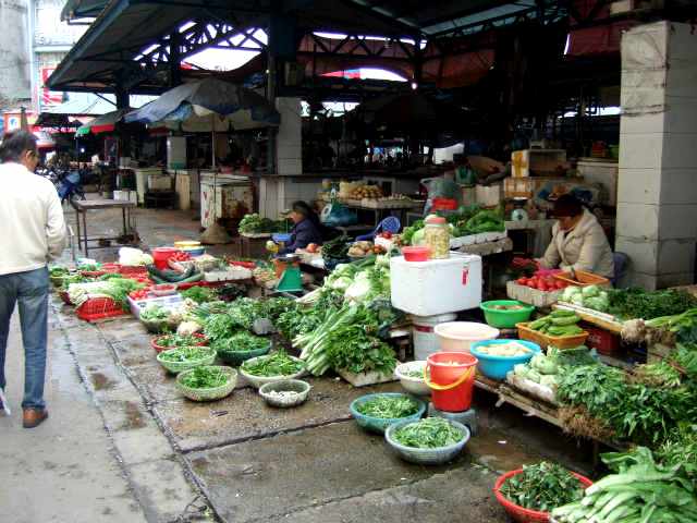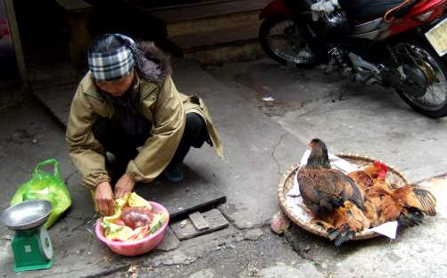 ![]() 生きたニワトリ(足が縛られた)がザルの上に乗せられて販売 ニワトリを絞めて、料理用にするのは別なお店でお金を払うか、もしくは自宅で行うとの事。 |