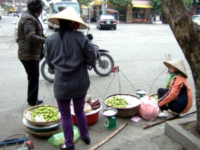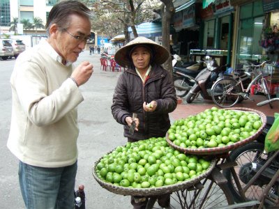 ![]() 試食を心配そうにノン(菅笠)をかぶり見ている売り子さん。 |