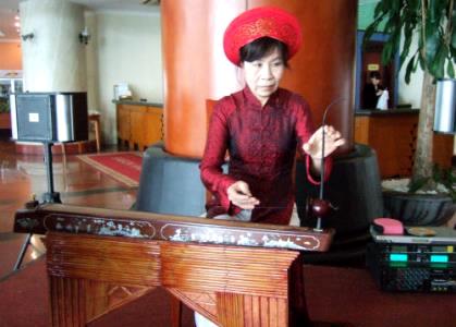 ![]() 1000年以上の歴史を持つ『ダン・バウ』 ベトナム独自の発達をした、伝統楽器の代表とでもいうべき世界でも珍しいタイプの1弦琴。 弦を弾くと同時に、台箱の上に差し込まれた棒をしならせ、糸の張りを調節して曲を奏でる |