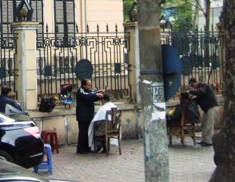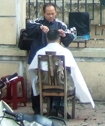 髪の毛を散らしカットしてる路上の散髪屋さん! 風が行けば散らされる髪! 散髪散髪! |