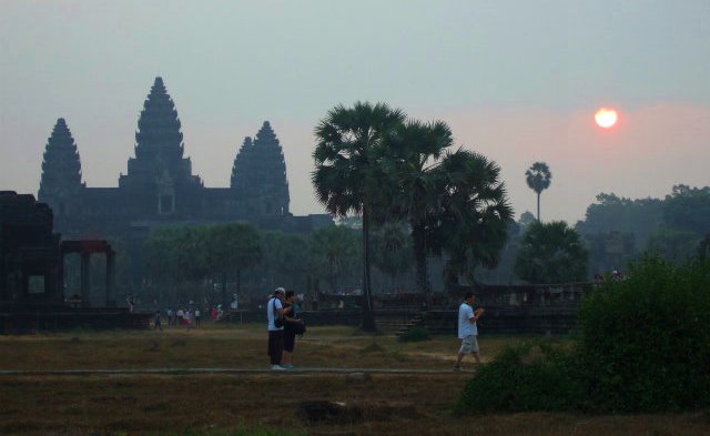 ![]() 日の出を待つ観光客が眠い目を凝らして待つと、遺跡から太陽が昇ってきました。 |