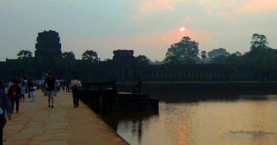 ![]() 幅100mの広い濠に囲まれたアンコール・トムの日の出 |