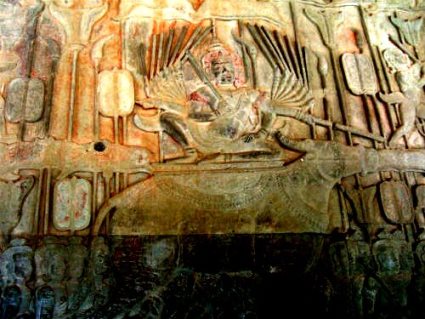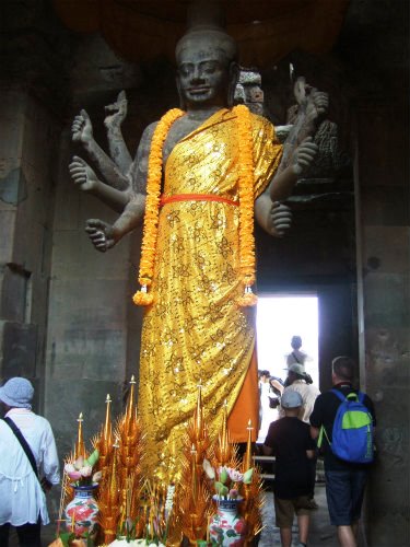 ![]() 西塔門のそばにあるヴィシュヌ像です。ヒンズー教の三大最高神(ブラフマー 神・ヴィシュヌ神・シヴァ神)の一つ。 4本の腕を持ち、世界を維持する役目を負っています。 このアンコールワットは、自分の死後の墓として、また、ヴィシュヌ神に捧げるものとして建造されたのです。 |