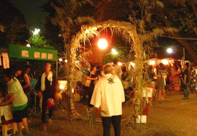 ![]() 茅の輪『茅草(かやくさ)で作られた大きな輪』をくぐると、正月から六月までの罪穢(つみけがれ)が祓われる。 左まわり・右まわり・左まわりと、八の宇を書くように三度くぐると・・・ |