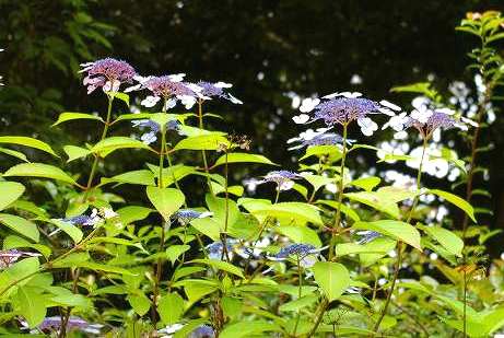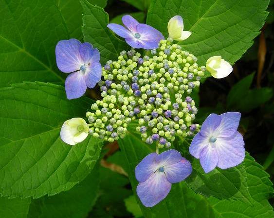 ![]() 《山アジサイ》 薄暗い林の下や沢沿いに生え、花の色は赤,青,白で、葉に光沢がない。 |