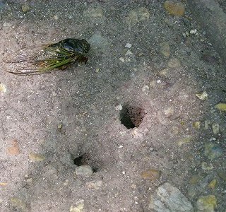 セミの穴と寿命尽きかけたクマゼミ