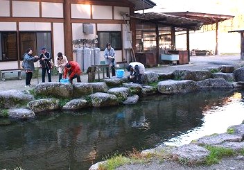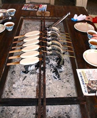 お客は私達だけ、炭火焼で暖取りながら、五平餅・アマゴかイワナ・味噌汁・・・7人¥9250