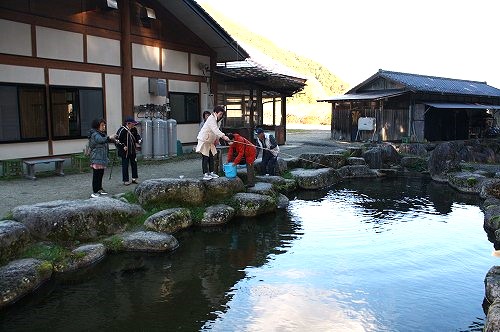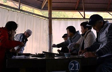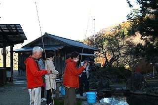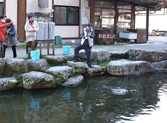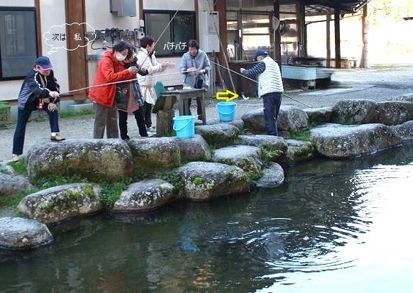 (最初は青木屋へ行くも、釣り堀が見えないほどの先客が「こりゃダメダ!」。 Pに団体バスが止まっていました。)