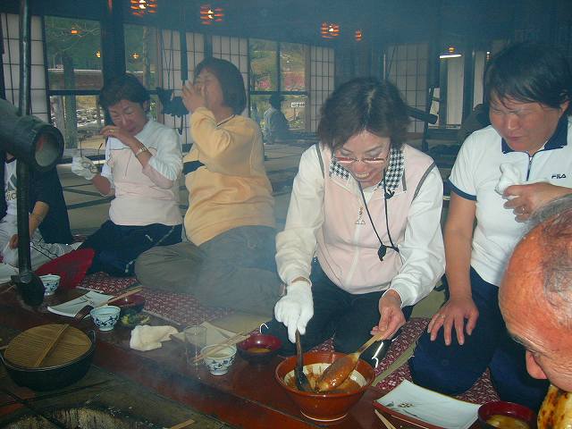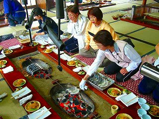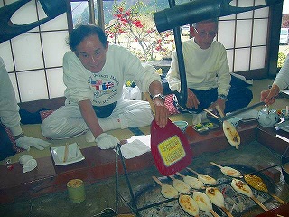 皆さんいい表情してますね〜!味噌が垂れ、燃えて煙がモッコモコ。 |