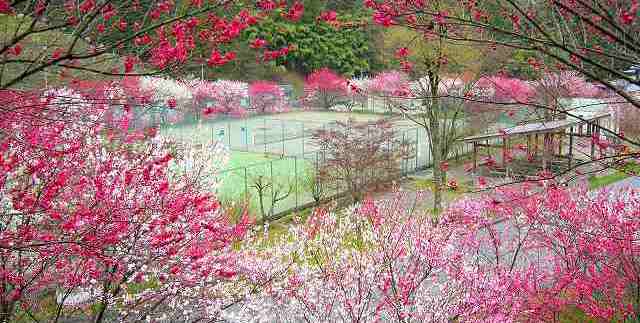 『はなもも』に囲まれた「月川のテニスコート」(雨のためガッカリ!) |